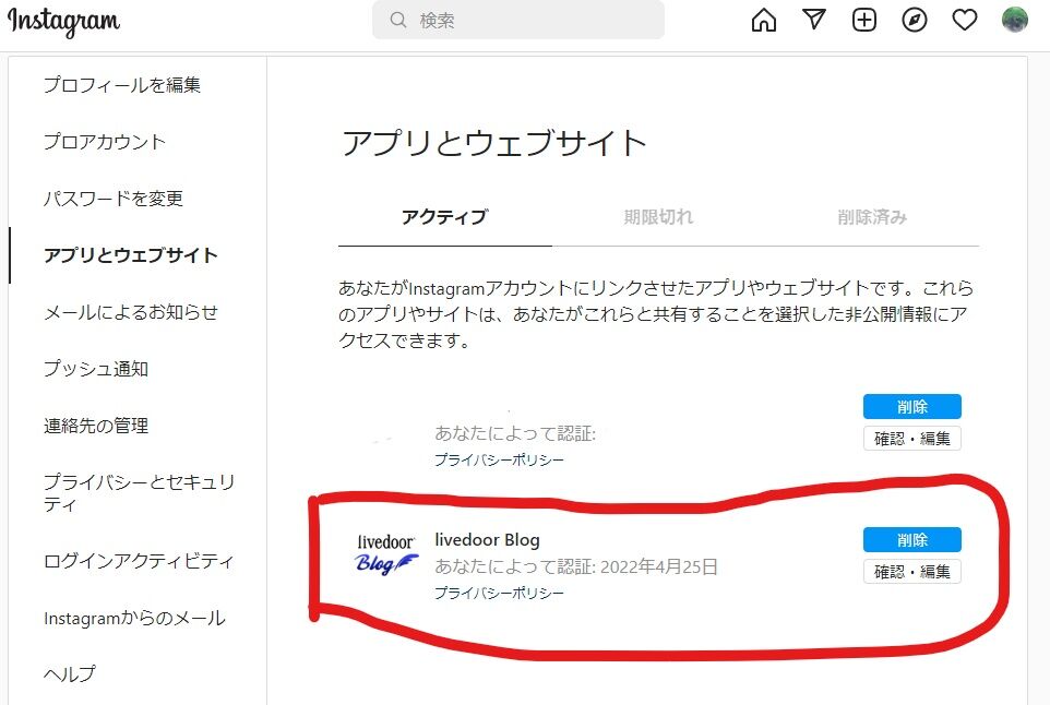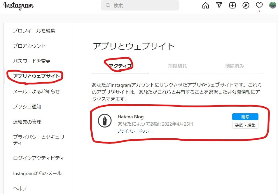 nstagram連携を削除(はてなのInstagram連携設定を『連携を解除する』をクリック!)