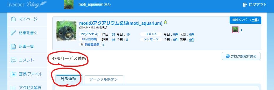 ②画面右上に表示されている「ブログ設定」をクリック!⇒「外部サービス」をクリック!